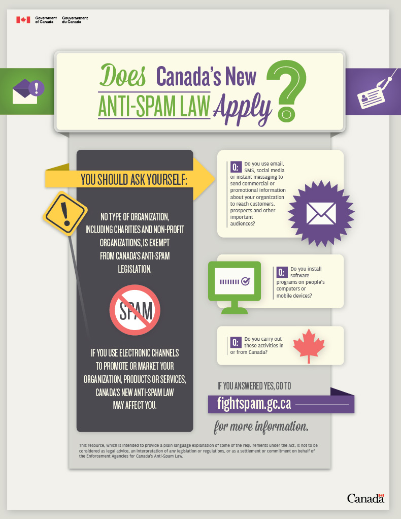 “Canadians deserve to be protected from spam and other electronic threats so that they can have confidence in digital technology,” said Navdeep Bains, Minister of Innovation, Science and Economic Development in a press release. “At the same time, businesses, charities and other non-profit groups should have reasonable ways to communicate electronically with Canadians. We have listened to the concerns of stakeholders and are committed to striking the right balance.”