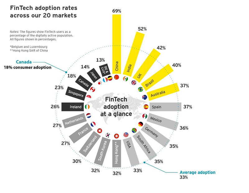 Fintech adoption in Canada has doubled over the past two years but it still lags behind most of the world in adopting services from online financial providers.