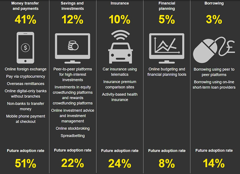 Adoption rates however differ across different fintech categories or sectors. Money transfer and payments services were, and continue to be, the most popular fintech service, growing from 18 per cent in 2015 to 50 per cent in 2017. Insurance has made great strides, moving from being the least commonly used service in 2015 to the second most popular service this year, largely due to the inclusion of insurance premium comparison services.