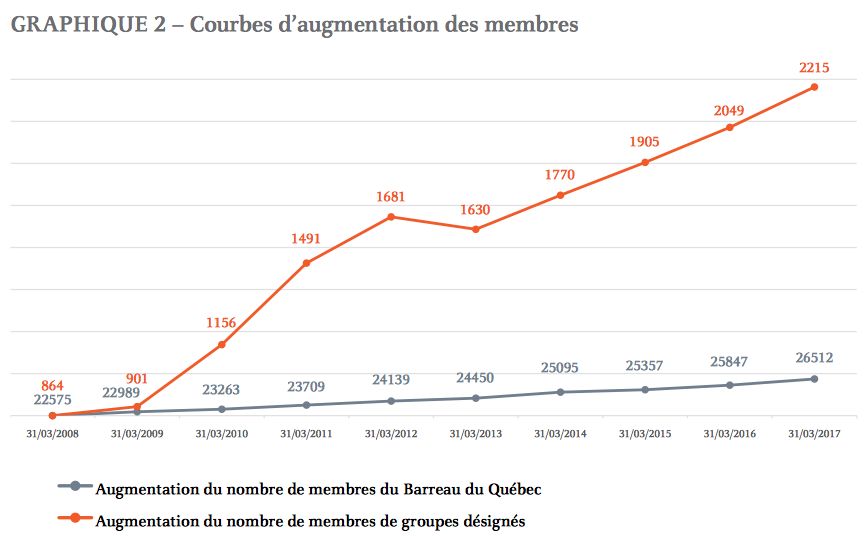 The number of lawyers who identify themselves as being part of an Aboriginal, an ethno-cultural, or handicapped group has grown by 156 per cent since 2008, from 864 to 2,215 members in 2017. That represents 8.4 per cent of the total number of Quebec lawyers. The numbers are broken down as follows: