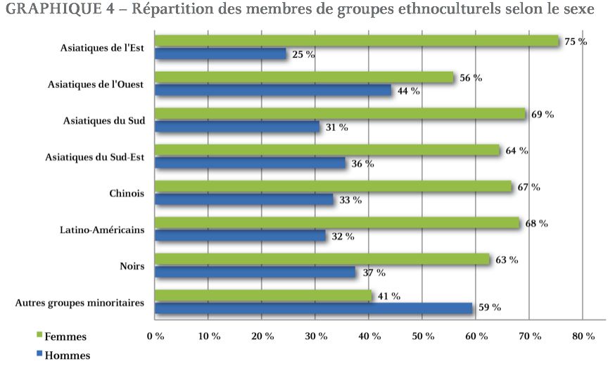 Women make up 52 per cent, or 13,899, of Quebec Bar members. The average age of Quebec female lawyers stands at 41 (compared to 45 for men), and have on average been practicing for 14 years (compared to 21 for men). The majority of women, or 58 per cent, identify themselves as belonging to an ethno-cultural group.
