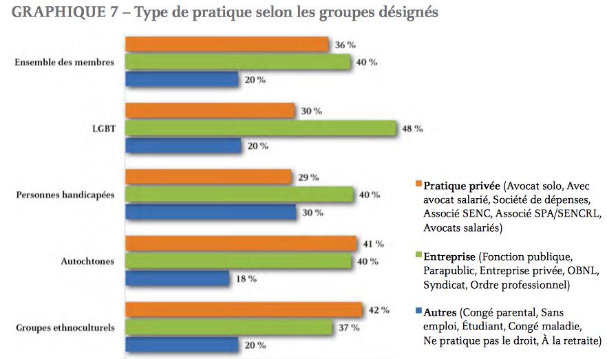 Only 30 per cent of LGBT Quebec Bar members work in the private sector, compared to 29 per cent who are handicapped, 41 per cent who are Aboriginal, and 42 per cent who are minorities.